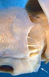 Click on an image to view larger version & data in a new windowFigure. Left photographs - Lateral and dorsoblique views of the occipital folds, A. lichtensteinii, Type A, preserved, 110 mm ML, 20°27'N, 21°58'W, USNM 294756. Photograph by R. Young.. The white arrows point to occipital fold number 3. Right drawings - Dorsal and lateral views of head and occipital folds, A. lichtensteinii, 145 mm ML, Mediterranean Sea. Drawings from Pfeffer, 1912.