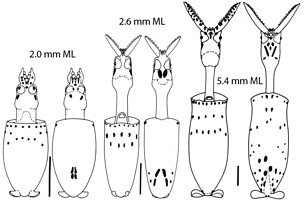 Paralarvae illustrated below show changes in form and chromatophore patterns with growth.