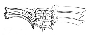 Figure. Drawing of a section of the radula in Carinaria cristata. To distinguish between the shapes of the two marginal and the single lateral teeth that are present on both sides of the central tooth in each tooth row, marginal teeth are illustrated on the left and lateral teeth on the right of the central tooth row. © 1976 S. van der Spoel