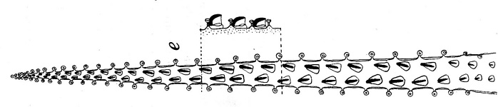 - Posterior 3/16 of gladius with secondary lateral plates.
