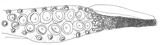- Spermatophore: "Spermatophore cone at oral end of cement body, a low, right-isosceles triangle with rounded corners in outline; oral tube long, narrow; aboral neck long, narrow" (Roper, et al., 1998).
