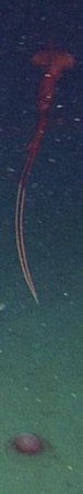 Figure at right. Dorsolateral view of a mastigoteuthid, presumably Mt. pyrodes, off Southern California at 631 m depth with tentacles extended apparently feeding on plankton near the ocean floor. See "Behavior" on the Mastigoteuthidae page. Photograph © 2011 MBARI.