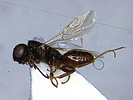 The ovipostional behavior of Megalyridae is regarded as quite primitive, as compared with complex drilling skills evolved by Ichneumonidae and Braconidae. Megalyra fasciipennis begins the process by locating a frass-filled tunnel. The wasp positions herself so the ovipositor tip touches the frass-plug, then the ovipositor is slowly forced into the hole (Rodd 1951). Field observations suggest that megalyrid wasps simply poke their ovipositor into pre-existing cavities, holes, or cracks, rather than drilling into solid wood (Hacker 1913; Rodd 1951). This "hole-poking" behavior may provide a simple explanation for the transition from beetle larvae to wasp larvae in mud nests: the megalyrids are simply poking their ovipositors into a different kind of hole - wasp nest entrances rather than frass-filled beetle galleries. It should be noted that these biological observations are limited to a few species with comparatively quite long ovipositors. Many of the Neotropical, Afrotropical, and Oriental species, especially those in the genera Cryptalyra, Dinapsis, and Ettchellsia, have much shorter ovipositors. It seems unlikely that these species could either be attacking hosts deep in plant tissue or concealed inside nests. More likely they are attacking host insects very near the surface of plants or hosts that are not concealed, but the hosts for these megalyrids still remain a mystery.