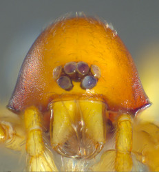 Oonopidae are small, short-legged, mostly six-eyed spiders. They vary widely in carapace shape, eye arrangement, and degree of body sclerotisation. Some genera are soft-bodied (e.g. Orchestina) while others are heavily armoured (e.g. Opopaea, in which the abdomen is almost completely covered by sclerotized plates). Female genital morphology is highly variable within the family, with some species having ‘cul-de-sac’ spermathecae and others having entelegyne-type genitalia (e.g. Burger et al. 2003, Platnick and Dupérré 2009). Male palpal morphology also varies tremendously (see e.g. Saaristo 2001). Some oonopid genera have evolved truly bizarre pedipalps. In Ischnothyreus, for example, the male palp is completely sclerotized and appears pitch-black (e.g. Edward and Harvey 2009), while in Camptoscaphiella the palpal patellas have become hugely enlarged (e.g. Baehr and Ubick 2010). In other genera the males express peculiar somatic characters. For example, males of Unicorn have clypeal horns, and males of the genus Cavisternum are characterised by elongated cheliceral fangs and a strongly concave sternum (Baehr et al. 2010, Platnick and Brescovit 1995).