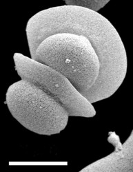 Comments Scanning electron microscope image of two hat-shaped ascospores of Kodamaea anthophila; This yeast species is dispersed between ephemeral flowers, including Hibiscus spp., by beetles.