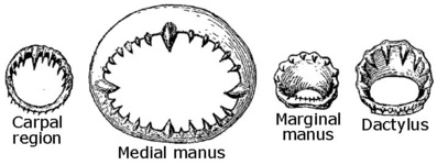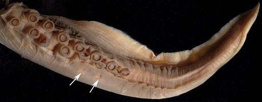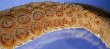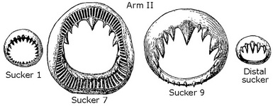 - Arm suckers of arm II: Largest suckers with much larger distal teeth than proximal teeth; distal teeth not of uniform size. Distal arm suckers with smooth proximal margins. Basal suckers somewhat irregular.