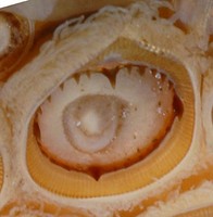 Click on an image to view larger version & data in a new windowFigure. Frontal view of the funnel component of the funnel/mantle locking-apparatus of S. oualaniensis showing the region where fusion to the dorsal component occurs. Left - Funnel component. Middle - Mantle component. Arrow points to an area where a strip of tissue torn was off the mantle when the two components were broken apart. Right - Anterior tips of the mantle component (top) and funnel component (bottom). Photographs by R. Young.