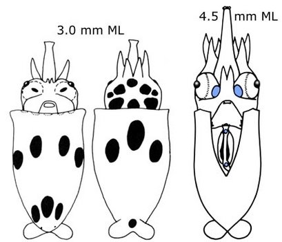 Figure. Paralarval S. oualaniensis. Left - Oral view of the suckers at the tip of the proboscis. Photograph from Harman and Young (1985). Middle - Typical chromatophore pattern at 3.0 mm ML. Drawing from Young and Hirota (1990). Right - Photophore arrangement (blue): ocular photophores and two intestinal photophores. Drawing from Harman and Young (1985).